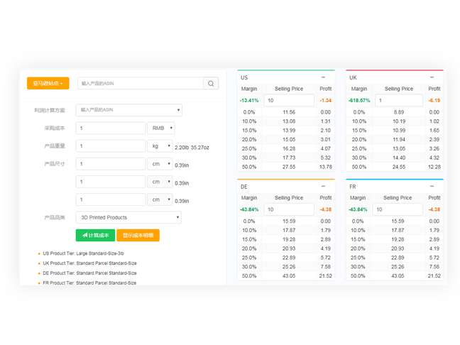 Provide reference for the development pricing of new products, simplify calculations, avoid unreasonable pricing resulting in losses, and maximize profits. By analyzing the parameters of the goods, you can control costs and increase profits. Finely show the cost of selling different products: purchase costs, shipping costs, Amazon commissions, FBA fees, and VAT taxes.