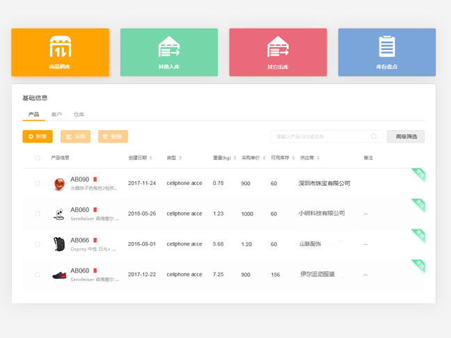 Manage the information of products, customers and warehouses, and provide support for the invoicing of products.