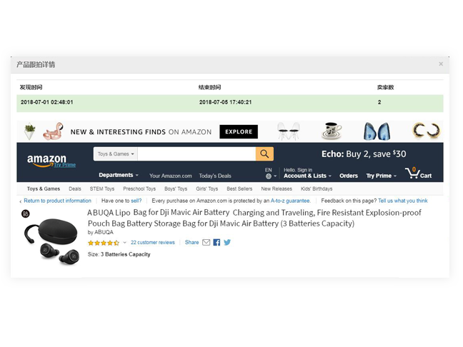 Real-time monitoring of Amazon's listing hijacking situation, dynamic acquisition of the time of hijacking, the time of the other party's removal, the number of hijacked products and hijackers, to avoid affecting traffic, orders and sales.