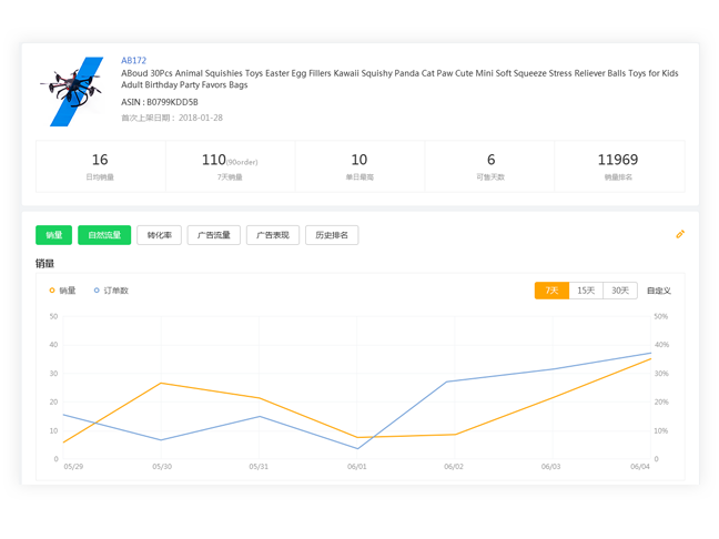 Provides comprehensive product sales data (average daily sales, 7-day/30-day sales, visits, conversion rate), as well as advertising data and cost profit data.